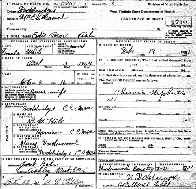 Born: Dec- 5-1853 in Virginia (now West Virginia) 1 (see note 1) Died: Apr- 7-1938 in McClellan District, Doddridge Co, WV 1 Buried: in Underwood Cemetery, near Ashley (Rt 23), Doddridge Co, WV 1,2 Census: 1910 in Ohio Twp, Beaver Co, PA Census: 1900 in Daugherty Twp, Beaver Co, PA Census: 1870 in McClellan District, Doddridge Co, WV Census: 1860 in Doddridge Co, (W)VA Occupation: 1910 farmer 3 Occupation: 1900 laborer on sewer pipework 4 Father: Samuel Ash (1820 - 1863) Mother: Nancy Ann Underwood (1823 - 1903)Wife: Eda Ann Kile Also known as: Edie Ann Kile 5 Married: ca 1883 4 (see note 2) Born: Oct- 3-1864 in Doddridge Co, (W)VA 5,4,6 Died: Feb-19-1931 in McClellan District, Doddridge Co, WV 5 Buried: in Underwood Cemetery, near Ashley (Rt 23), Doddridge Co, WV 5 Cause of death: chronic nephritis 5 Census: 1910 in Ohio Twp, Beaver Co, PA Census: 1900 in Daugherty Twp, Beaver Co, PA Census: 1870 in McClellan District, Doddridge Co, WV Father: George W. Kile (1826 - 1899) Mother: Sarah "Sally" Underwood (1829 - 1913)