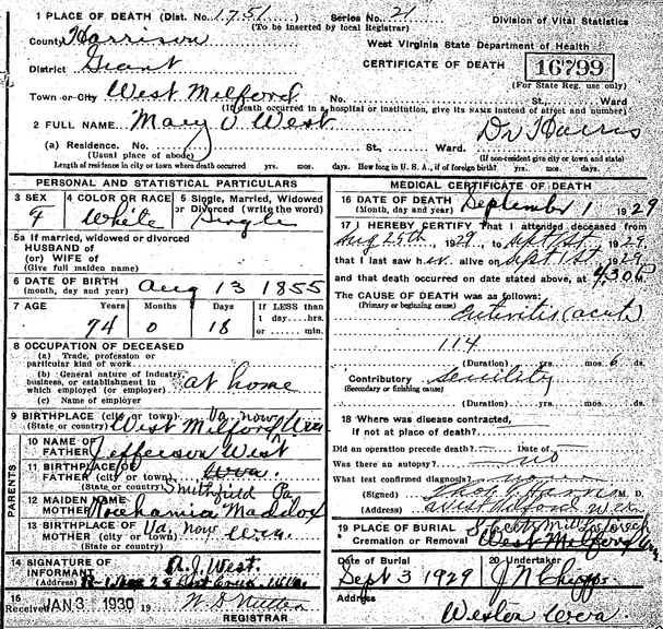 Sources: (1) William F. Donnelly, The Wests of Duck Creek, Harrison County, Virginia (now West Virginia), Gateway Press, Baltimore MD, 1997, p. 553. (2) Death record of son. (3) Headstone. (4) William F. Donnelly, The Wests of Duck Creek, Harrison County, Virginia (now West Virginia), Gateway Press, Baltimore MD, 1997, p. 465. (5) W. N. Hurley, Jr., Maddox: A Southern Maryland Family, Heritage Books, Bowie, MD, ISBN 0-788-0123-8, 1994, p. 106. (6) WV State Dept of Health, Div of Vital Statistics, Death Certificate (http://www.wvculture.org/vrr/va_dcsearch.aspx) (7) 1880 Census, Harrison County, WV. (8) 1910 Census, Harrison County, WV. (9) WV State Dept of Health, Div of Vital Statistics, Death Certificate (http://www.wvculture.org/vrr/va_dcsearch.aspx). "The Wests of Duck Creek," p. 466, reports birth date as Sep 13 1855, but death certificate states Aug 13 1855. (10) 1900 Census, Marshall County, WV. (11) William F. Donnelly, The Wests of Duck Creek, Harrison County, Virginia (now West Virginia), Gateway Press, Baltimore MD, 1997, p. 466. (12) Cemeteries of Clark District, Harrison County, WV, Harrison County Genealogical Society, Clarksburg, WV. (13) Marshall County Marriage Records, Moundsville, WV. (14) 1920 Census, Harrison County, WV. (15) William F. Donnelly, The Wests of Duck Creek, Harrison County, Virginia (now West Virginia), Gateway Press, Baltimore MD, 1997, p. 554. (16) Harrison County WV Marriages 1895-1912, Wes Cochran, 2515 10th Ave, Parkersburg, WV 26101 (Feb 2001) (17) Harrison County WV Marriages 1895-1912, Wes Cochran, 2515 10th Ave, Parkersburg, WV 26101 (Feb 2001), Identified as Hiram T. West, 29, b. & res. in Harrison Co, son of Jefferson B. & Ruhama West; and Allie Belle Davis, 20, b. & res. in Harrison Co, dau of Wm. & Mary Davis. Married Jul 28 1895 in West Milford. MR p. 87. (18) William F. Donnelly, The Wests of Duck Creek, Harrison County, Virginia (now West Virginia), Gateway Press, Baltimore MD, 1997, p. 470. (19) William F. Donnelly, The Wests of Duck Creek, Harrison County, Virginia (now West Virginia), Gateway Press, Baltimore MD, 1997, p. 425. (20) Harrison County Marriage Records, Clarksburg, WV. (21) Harrison County Marriage Records, Clarksburg, WV, Identified as James Warner Kerby, 26, b. Harrison Co Ohio, res. Harrison Co WVa, son of James F. & Jeannie Kerby; and Emma Francis West, 31, b. & res. in Harrison Co WVa, dau of Jefferson & Ruhama West. Married Sep 1 1901 in West Milford. Informants for the marriage license: James W. Kerby & Jed West. MR p. 209. (22) WV State Dept of Health, Div of Vital Statistics, Death Certificate (http://www.wvculture.org/vrr/va_dcsearch.aspx). "The Wests of Duck Creek," p. 466, reports birth date as Jul 3 1872, but death record states Jul 3 1873, and 1900 Census also shows it as Jul 1873. (23) 1900 Census, Harrison County, WV. (24) Death record of brother. (25) Cemeteries of Union District, Harrison County, WV, Harrison County Genealogical Society, Clarksburg, WV (1990) (26) Harrison County Death Records, Clarksburg, WV. (27) Death record of husband. Event Notes Note (1) Bell Run Note (2) Age 43 in 1920 Census would put birth in about 1877, but all other records support the 1866 birth date. Note (3) Birth date given in death record as Feb 8 1878, but 1900 Census states birth date as Feb 1879.Name Index