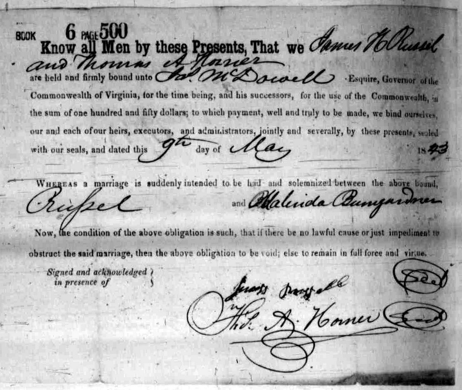 Wife: Malinda Bumgardner Marriage Bond: May- 9-1843 in Harrison Co, (W)VA 6 Married: May- -1843 Born: ca 1825 7 Died: bef Dec 1858 8 Census: 1850 in Doddridge Co, (W)VA Father: Mother: