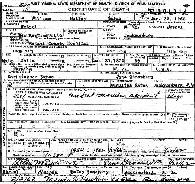 Jul-28-2018Husband: William Notley Bates Census name: William A. Bates Born: Jan- -1872 in Harrison Co, WV 1,2 (see note 1) Died: Jan-22-1962 in New Martinsville, Wetzel Co, WV 3 Buried: in Lieutz-Bates Cemetery, Jacksonburg, Wetzel Co, WV 4,5 Resided: in Jacksonburg, Wetzel Co, WV 4 Census: 1940 in Clarksburg, Harrison Co, WV Census: 1930 in Bridgeport, Harrison Co, WV Resided: 1929 in Hastings, Wetzel Co, WV 6 Census: 1920 in Brooklyn, Wetzel Co, WV Census: 1910 in McClellan District, Doddridge Co, WV Census: 1900 in Grant District, Wetzel Co, WV Census: 1880 in McClellan District, Doddridge Co, WV Occupation: farmer 4,7 Father: Christopher Bates (1840 - 1904) Mother: Elma Jane Strother (1842 - 1923) Other spouse 2 Other spouse 3