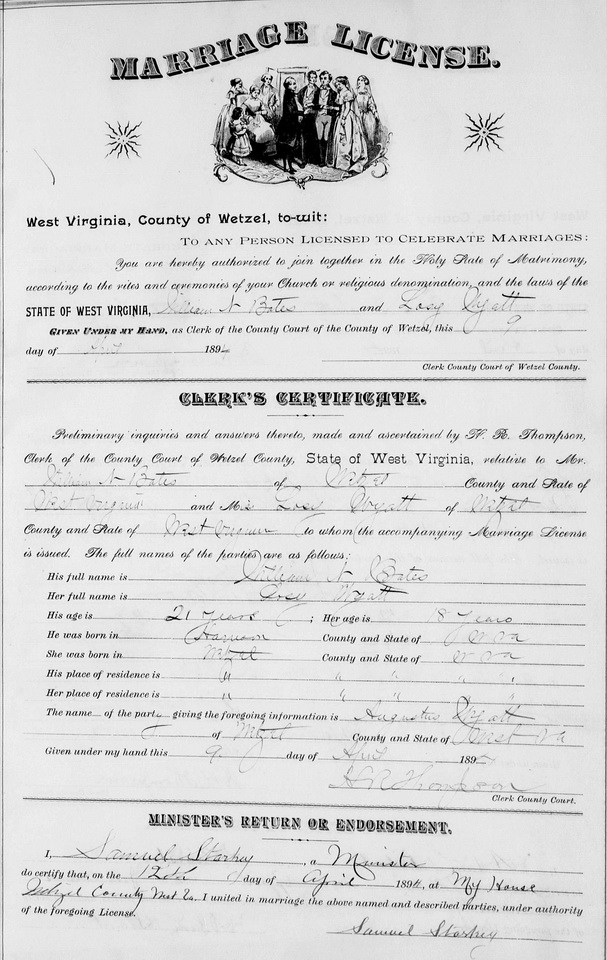 Sources: (1) 1880 Census, Doddridge County, WV (McClellan District). (2) Doddridge County Marriage Records, West Union, WV. (3) West Virginia Deaths Index, 1853-1973 [database on-line], Ancestry.com. (4) WV State Dept of Health, Div of Vital Statistics, Death Certificate (http://www.wvculture.org/vrr/va_dcsearch.aspx) (5) Findagrave.com. (6) Harrison County Marriage Records, Clarksburg, WV, http://www.wvculture.org/vrr/va_view.aspx?Id=33900&Type=Marriage. (7) Doddridge County Marriage Records, West Union, WV, http://www.wvculture.org/vrr/va_view.aspx?Id=11793635&Type=Marriage. (8) Wetzel County Marriage Records, New Martinsville, WV, Identified as William N. Bates, 21, b. Harrison Co, res. Wetzel Co; and Losy Wyatt, 18, b. & res. in Wetzel Co. Married Apr 12 1894 at the residence of Samuel Starkey, the officiating minister. Informant for marriage license: Augustus Wyatt. http://www.wvculture.org/vrr/va_view.aspx?Id=11596447&Type=Marriage. (9) Headstone (year only) (10) Findagrave.com, Headstone inscription: Rosie Wyatt Bates, 1876-1898, We will meet again. (11) National Archives and Records Administration, World War II Draft Registration Cards, 1942 (Ancestry.com online database) (12) National Archives and Records Administration, World War I Draft Registration Cards, 1917-1918 (Ancestry.com online database) (13) Social Security Death Index. (14) Social Security Death Index, Social Security card issued in West Virginia before 1951. (15) Death record of father. (16) 1940 Census, Wetzel County, WV. (17) 1920 Census, Wetzel County, WV. (18) Headstone. (19) Wetzel County Marriage Records, New Martinsville, WV, http://www.wvculture.org/vrr/va_view.aspx?Id=11622825&Type=Marriage. (20) Wetzel County Birth Records, New Martinsville, WV, http://www.wvculture.org/vrr/va_bcdetail.aspx?Id=2473699. (21) WV State Dept of Health, Div of Vital Statistics, Death Certificate (http://www.wvculture.org/vrr/va_dcsearch.aspx), http://www.wvculture.org/vrr/va_view.aspx?Id=1061747&Type=Death. (22) Findagrave.com, Name on headstone: Crissie Bates. Event Notes Note (1) Birth date given in 1920 marriage record as Jan 22 1872, but in death record as Jan 27 1872.Name Index