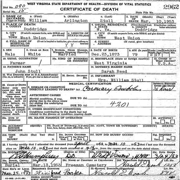 Jul-28-2018Husband: William Arlington Stull Census name: Will Stull Born: 1872 1 Died: Mar-10-1953 in West Union, Doddridge Co, WV 2,3,4 Buried: in Freeman Cemetery, Piggin Run, West Union, Doddridge Co, WV 2,5,6 Resided: in West Union, Doddridge Co, WV 2 Census: 1900 in Centerville District, Tyler Co, WV Occupation: farmer 2 Father: John A. Stull (1843 - 1924) Mother: Sarah Ann Reed (1853 - 1900)