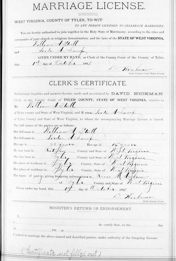 Wife: Birdie Ann Lamp Also known as: Vera Ann Lamp 7 Married: Oct- 1-1898 7 Born: Oct-14-1882 in Tyler Co, WV 8,7,9,4 Died: Feb-20-1955 in Massillon, Stark Co, OH 8,7,4 Buried: in Freeman Cemetery, Piggin Run, West Union, Doddridge Co, WV 5,6,8 Census: 1900 in Centerville District, Tyler Co, WV Father: Mother: Notes Notes