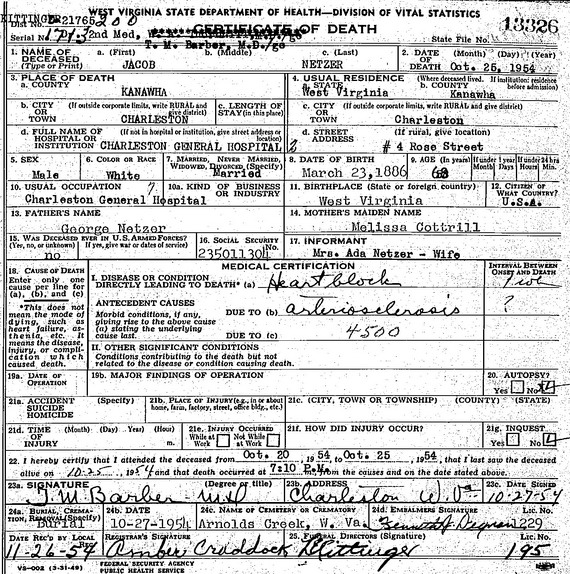 Jul-28-2018Husband: Jacob Calvin Netzer Born: Mar-23-1886 in Doddridge Co, WV 1,2 Died: Oct-25-1954 in Charleston, Kanawha Co, WV 3,1 Buried: in Ruley Cemetery, Arnolds Creek, Doddridge Co, WV 1 Resided: in Charleston, Kanawha Co, WV 3 Census: 1930 in Charleston, Kanawha Co, WV Census: 1910, 1920 in Clark District, Harrison Co, WV Census: 1900 in New Milton, Doddridge Co, WV 2 Occupation: 1910 snapper in glass house 4 Occupation: 1920 rung man at glass plant 5 Occupation: 1930 messenger for State of West Virginia 6 Father: George Washington Netzer (1860 - 1942) Mother: Exelissa Cottrill (1860 - 1913)