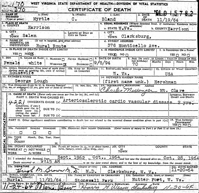 Wife: Myrtle Cotha "Tressie" Lough Census name: Cotha M. Lough Married: Sep-30-1916 in Clarksburg, Harrison Co, WV 2 Born: Sep- 5-1894 in Gilmer Co, WV 5,2 Died: Nov-19-1964 near Salem, Harrison Co, WV 5 Buried: in Stonewall Park Cemetery, Stonewood, Harrison Co, WV 5 Resided: in Clarksburg, Harrison Co, WV 5,6 Census: 1940 in Ripley District, Jackson Co, WV Resided: 1935 in Lewis Co, WV 7 Census: 1920 in Clarksburg, Harrison Co, WV Resided: 1916 in Harrison Co, WV 2 Census: 1900, 1910 in Glenville District, Gilmer Co, WV Father: George Washington Lough (1859 - 1907) Mother: Marinda Angeline Hersman (1861 - 1918) Other spouse 2 Notes