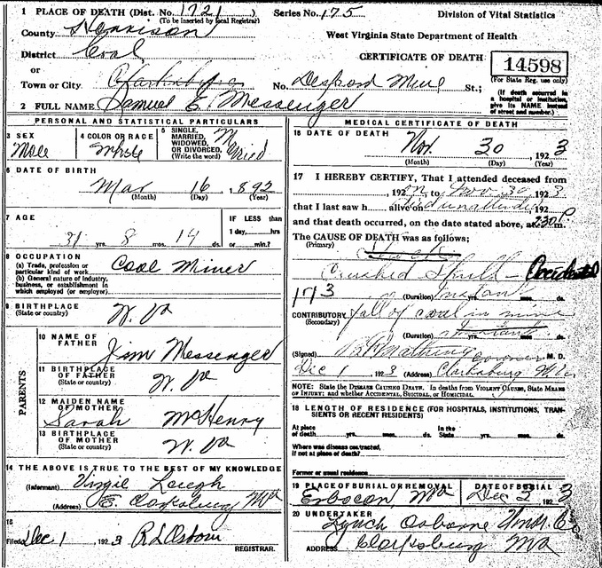 Jul-28-2018Husband: Samuel Everett Messenger Also known as: Samuel Everett Ray Messenger 1 Born: Mar-16-1892 in Gilmer Co, WV 2,3 Died: Nov-30-1923 in Harrison Co, WV 3 Buried: in Erbacon, Webster Co, WV 3 Cause of death: crushed skull from fall of coal in mine 3 Census: 1920 in Clarksburg, Harrison Co, WV Resided: 1916 in Clarksburg, Harrison Co, WV 2 Occupation: coal miner 3 Occupation: 1920 glass factory worker 4 Father: James Samuel Messenger (1867 - 1945) Mother: Sarah Alda McHenry (1861 - 1910)