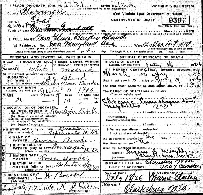 Wife: Glena Vana "Glennie" Bender Married: Feb-14-1926 in Nutter Fort, Harrison Co, WV 5 Born: Jul- 3-1900 6 (see note 1) Died: Jul-16-1926 in Nutter Fort, Harrison Co, WV 6 Buried: IOOF Shinnston 6 Cause of death: nephritis 6 Resided: in Nutter Fort, Harrison Co, WV 6,5 Occupation: clerk for B & O Railroad 6 Father: Henry Y. Bender Mother: Rosa Woods