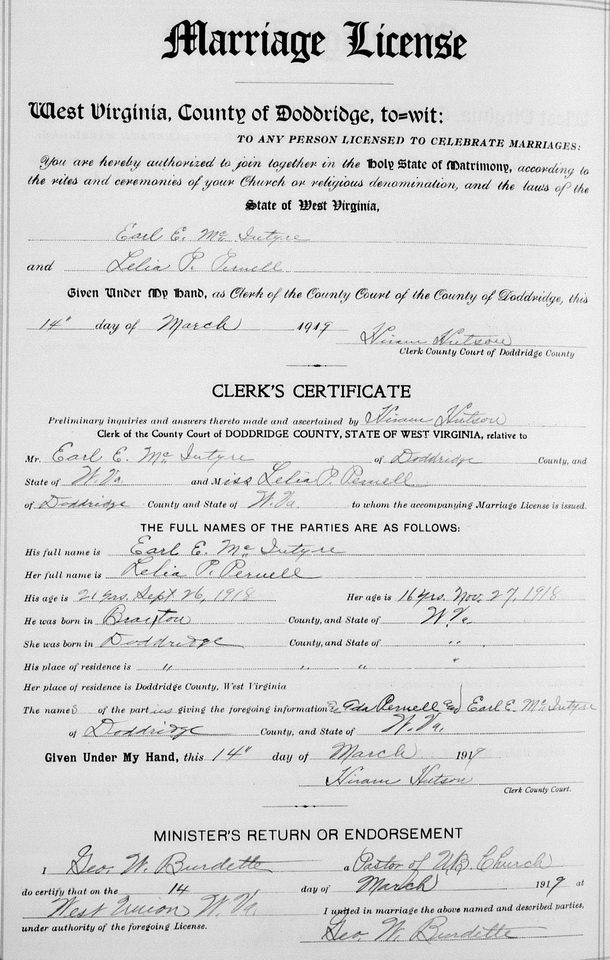 Jul-28-2018Husband: Earl E. McIntyre Born: Sep- -1898 in Braxton Co, WV 1,2 Died: Aug-15-1954 in Monongalia Co, WV 3 Resided: 1942 in Morgantown, Monongalia Co, WV 4 Census: 1940 in Morgan District, Monongalia Co, WV Census: 1930 in Grant District, Monongalia Co, WV Census: 1920 in Grant District, Doddridge Co, WV Census: 1900 in Salt Lick District, Braxton Co, WV Occupation: 1940 coal miner 5 Occupation: 1930 laborer in coal mine 6 Father: Oliver Boyd McIntyre (1868 - 1939) Mother: Iola May Hickman (1870 - 1928)