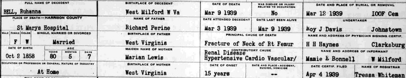 Sources: (1) 1870 Census, Doddridge County, WV (New Milton Twp). (2) WV State Dept of Health, Div of Vital Statistics, Death Certificate (http://www.wvculture.org/vrr/va_dcsearch.aspx) (3) John Mark Perine, Parkersburg WV 26102, Perine Family of North Central WV (self-published) (4) Harrison County Birth Records, Clarksburg, WV, But death record states birth date as Oct 2 1858, at West Milford. Informant for death record: Mamie E. Bonnell, West Milford, WV. BR Bk 1, p. 47. (5) Harrison County Marriage Records, Clarksburg, WV.Name Index