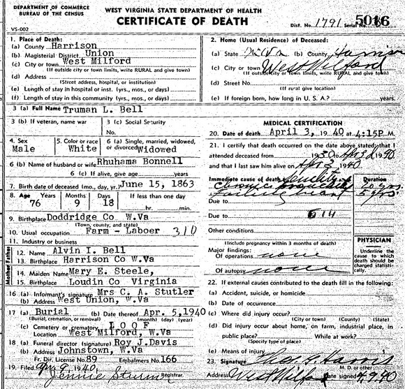 Jul-28-2018Husband: Truman L. Bell Census name: Trewman Bell 1 Born: Jun-15-1863 in Doddridge Co, (W)VA 2 Died: Apr- 3-1940 in West Milford, Harrison Co, WV 2 Buried: in Rose Hill (formerly IOOF) Cemetery, West Milford, Harrison Co, WV 2 Resided: in West Milford, Harrison Co, WV 2 Census: 1870 in New Milton District, Doddridge Co, WV Occupation: farm laborer 2 Father: Alvin I. Bell (1842 - 1909) Mother: Mary E. Steele (1835 - )