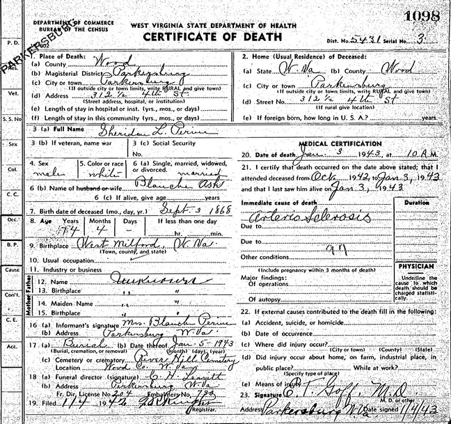 Jul-28-2018Husband: Sheridan Lewis Perine Born: Nov-25-1868 in West Milford, Harrison Co, WV 1 (see note 1) Died: Jan- 3-1943 in Parkersburg, Wood Co, WV 2 Buried: in River Hill Cemetery, Blennerhassett, Wood Co, WV 2 Resided: in Parkersburg, Wood Co, WV 2 Census: 1920 in Union District, Harrison Co, WV Father: Richard Perine (1794 - 1876) Mother: Mary Polly Lewis (1826 - 1876)