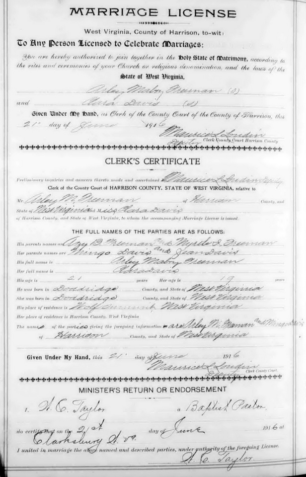 Wife: Clara Davis Census name: Clarah Davis Married: Jun-21-1916 in Clarksburg, Harrison Co, WV 6 Born: Sep- 1-1896 in Long Run, Doddridge Co, WV 7,8,3 Died: Aug-16-1939 Buried: in O'Neal (formerly IOOF) Cemetery, near Wilsonburg, Harrison Co, WV 7,5 Resided: in Wolf Summit, Harrison Co, WV 9 Resided: 1916 in Harrison Co, WV 3 Census: 1900 in Grant District, Doddridge Co, WV Father: Mingo Davis (1871 - ) Mother: Mary Imogene "Jean" Davis (1874 - )