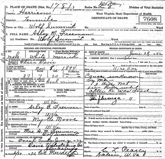 Jul-28-2018Husband: Arley Mabry Freeman Born: Nov- 8-1894 in Doddridge Co, WV 1,2,3 Died: Jun-28-1932 in Wolf Summit, Harrison Co, WV 1 (see note 1) Buried: in O'Neal (formerly IOOF) Cemetery, near Wilsonburg, Harrison Co, WV 4,5 Cause of death: influenza 1 Resided: in Wolf Summit, Harrison Co, WV 1,3 Occupation: coal miner 1 Father: Arza Brown Freeman (1860 - 1937) Mother: Myrtle Ida Moore (1876 - 1936)