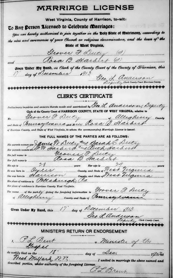 Wife: Rosa B. Harbert Married: Dec-18-1913 in West Milford, Harrison Co, WV 3 Born: ca 1884 in Harrison Co, WV 3 Resided: 1913 in Harrison Co, WV 3 Father: F. W. Harbert Mother: Ruth ___