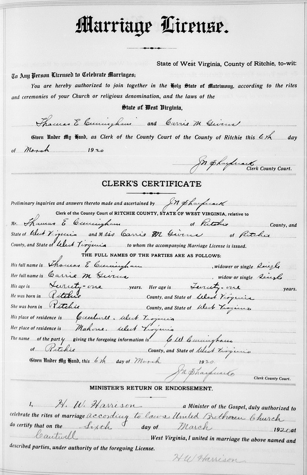Wife: Carrie M. Givens Census name: Cara M. Givens Married: Mar- 6-1920 in Cantwell, Ritchie Co, WV 5