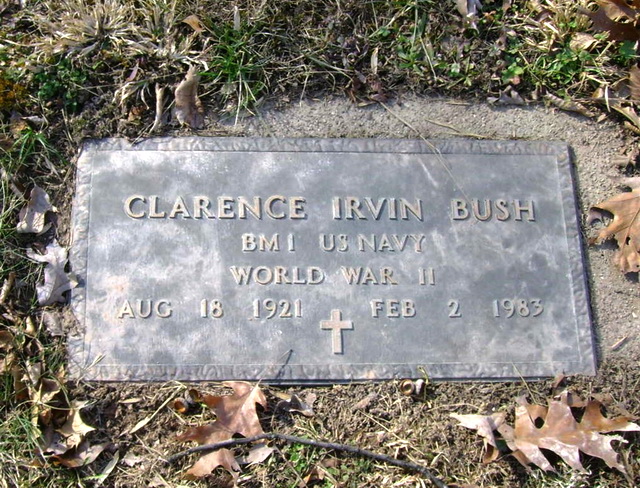 Jul-28-2018Husband: Clarence Irvin Bush Census name: Irvin Bush 1 Born: Aug-18-1921 2,3,4 (see note 1) Died: Feb- 2-1983 3,2 Buried: in South Fork Baptist Church Cemetery, Oxford, Doddridge Co, WV 5,6 Census: 1930, 1940 in Union District, Ritchie Co, WV Military: Apr-30-1942 - Dec-18-1946 BM1, US Navy, World War II (Pacific) 3,7 (see note 2) Father: Clarence Lafayette Bush (1891 - 1949) Mother: Nellie M. Pierce (1900 - 1984)