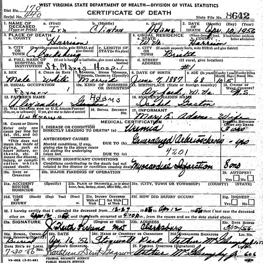 Jul-28-2018Husband: Ira Clinton Adams, Sr. Born: Jun- 7-1887 in Oxford, Doddridge Co, WV 1 Died: Apr-12-1956 in Clarksburg, Harrison Co, WV 1,2 Buried: in Stonewall Park Cemetery, Stonewood, Harrison Co, WV 1 Resided: in Bristol, Harrison Co, WV 3,1 Resided: 1929 in Quiet Dell, Harrison Co, WV 4 Resided: 1917 in Clarksburg, Harrison Co, WV 5 Census: 1900 in Southwest District, Doddridge Co, WV Occupation: farmer 1 Father: Alexander Adams (1855 - 1929) Mother: Mary Isabel "Bell" Gaston (1857 - 1929) Other spouse 1 Other spouse 2 Notes 3