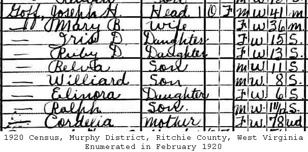 Jul-28-2018Husband: Joseph Hardman Goff Born: Sep-17-1878 1,2 Died: Mar-20-1967 in Ritchie Co, WV 3,1,2 Buried: in Hazelgreen (Buzzard) Cemetery (btwn Co Rds 19/4 & 19/5), Ritchie Co WV 4 Resided: in Auburn, Ritchie Co, WV 1 Father: Henry Leonis Goff (1845 - 1916) Mother: Cordelia D. Bee (1842 - 1921)