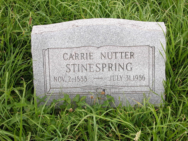 Born: May- -1887 1,2 Died: bef 1979 3 Resided: 1946 in Kankakee, Kankakee Co, IL 4 Resided: 1934 in Canton, McPherson Co, KS 5 Father: William Lewis Stinespring (1849 - 1911) Mother: Mary Ellen Dotson (1856 - 1935)Wife: Carrie Nutter 3,6 Married: Dec-25-1910 in Doddridge Co, WV 2 Born: Nov- 2-1888 in Doddridge Co, WV 7,8,9 Died: Jul-31-1986 in Madison, Boone Co, WV 7,8,9 Buried: in Oxford Baptist Church Cemetery, Doddridge Co, WV 9 Resided: 1950, 59 in Kankakee, Kankakee Co, IL 10,11 Father: Eli Marion Nutter (1853 - 1938) Mother: Mary Frances Maxwell (1858 - 1937) Notes 5,12,8,3