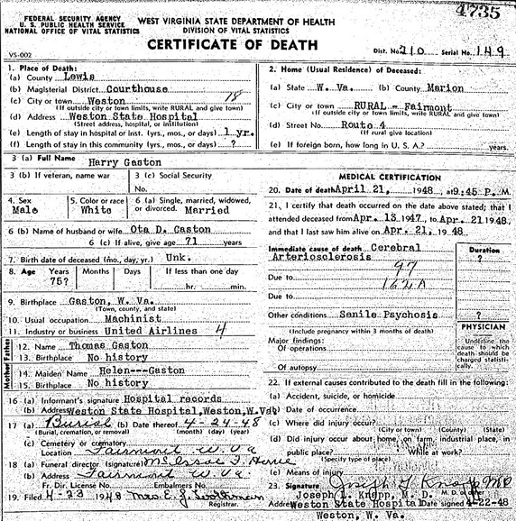 Jul-28-2018Husband: Harry Gaston Born: 1872 in Gaston, Lewis Co, WV 1 Died: Apr-21-1948 in Weston, Lewis Co, WV 1 Buried: in Fairmont, Marion Co, WV 1 Resided: near Fairmont, Marion Co, WV 1 Resided: 1929 in Seattle, King Co, WA 2 Occupation: machinist, United Airlines 1 Father: Thomas M. Gaston (1842 - 1913) Mother: Helen Summers (1851 - 1929) Notes