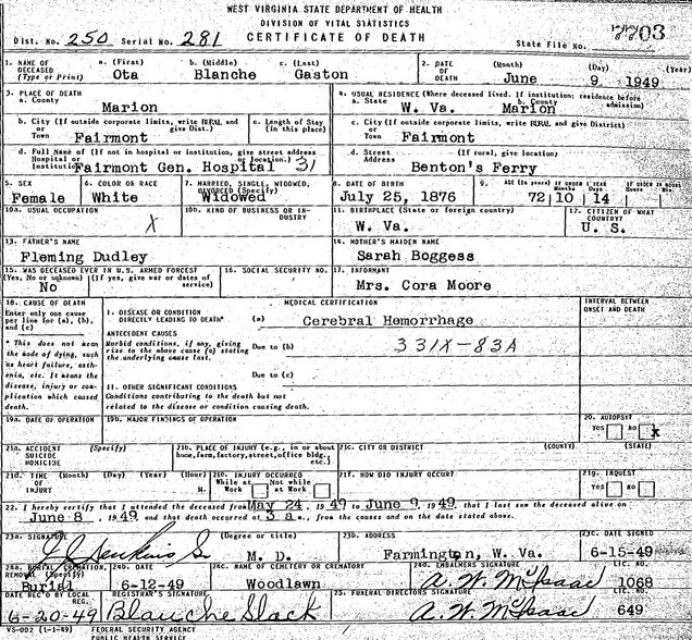 Wife: Ota Blanche Dudley Married: Oct-18-1900 in Marion Co, WV 3 Born: Jul-25-1876 1 Died: Jun- 9-1949 in Fairmont, Marion Co, WV 1 Buried: in Woodlawn Cemetery, Fairmont, Marion Co, WV 1 Resided: in Bentons Ferry (Fairmont), Marion Co, WV 1 Father: Fleming Dudley Mother: Sarah Boggess