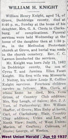 Jul-28-2018Husband: William Henry Knight Born: Jul-15-1862 in Doddridge Co, WV 1,2,3 Died: Jun- 6-1937 in Clarksburg, Harrison Co, WV 1,3 Buried: in Grove M.E. (aka Mt. Olive) Cem, Co Rt 19, Cove Crk Rd, Doddridge Co, WV 1,4 Resided: at Grove, Doddridge Co, WV 1 Census: 1920 in Southwest District, Doddridge Co, WV Census: 1900 in Cedarville, Gilmer Co, WV Occupation: farmer 5,3 Father: Cyrus Tucker Knight (1827 - 1903) Mother: Jemima Ellen Faust (1823 - 1895) Other spouse 1 Notes