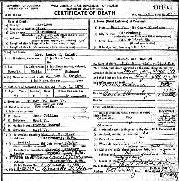 Sources: (1) Obituary. (2) Doddridge County Marriage Records, West Union, WV, MR Bk 2, p. 344. (3) WV State Dept of Health, Div of Vital Statistics, Death Certificate (http://www.wvculture.org/vrr/va_dcsearch.aspx) (4) Donald Edward Ramage, Doddridge County Cemeteries, Vol. II, 4117 Almaville Rd, Smyna TN 37167 (1988, rev. 1999) (5) Birth record of daughter. (6) Obituary of husband. (7) Death record of wife. (8) Obituary of daughter. (9) Obituary of son. (10) Death record of son. (11) One World Tree (www.ancestry.com) (12) Gilmer County Marriage Records, Glenville, WV. (13) Findagrave.com. (14) 1900 Census, Gilmer County, WV (Cedarville Precinct) (15) Obituary of brother. (16) 1930 Census, Harrison County, WV. (17) Harrison County Marriage Records, Clarksburg, WV. (18) The History of Doddridge County, West Virginia, Taylor Publishing Co, 1979, Although born Cyrus Smith Knight, he changed his name to read Smith Cyrus Knight after his employer, Hope Natural Gas Co, recorded his name in reverse. p. 186. (19) Birth record of son. (20) Obituary - Hospital. (21) West Union WV Cemeteries (Doddridge County), Wes Cochran, 2515 10th Ave, Parkersburg, WV 26101 (July 1990) (22) The History of Doddridge County, West Virginia, Taylor Publishing Co, 1979, p. 186. (23) 1920 Census, Doddridge County, WV (Southwest District). (24) Obituary of father. (25) Obituary of wife. (26) Marriage record of son. (27) 1930 Census, Doddridge County, WV (Cove District). (28) Doddridge County Birth Records, West Union, WV, Identified as William C. Knight, b. Mar 25 1906, son of W. H. & Lona Knight. BR Bk 4, p. 94. (29) 1940 Census, Doddridge County, WV (Cove District) (30) Social Security Death Index. (31) Social Security Death Index, Social Security card issued in West Virginia before 1951. (32) Doddridge County Birth Records, West Union, WV, Identified as Raymond Blair Knight, b. Apr 5 1910 in Blandville, son of William Henry Knight & Louie Collins. Informant identified as Stella Clovis, sister. This would actually be his half-sister, Stella M. Knight Clovis. BR Bk 4, p. 94. (33) Harrison County Death Records, Clarksburg, WV. (34) Doddridge County Birth Records, West Union, WV, Identified as Berlin Carl Knight, b. Feb 19 1912 in Blandville, son of William Henry Knight and Louie Collins. Informant: Stella Clovis, sister (actually, half-sister). BR Bk 4, p. 95. (35) Marion County Marriage Records, Fairmont, WV. (36) 1940 Census, Harrison County, WV. (37) Doddridge County Birth Records, West Union, WV, Identified as George Oliver Knight, b. Aug 4 1913 in Blandville, son of William & Lowe [sic] Knight. Original typed entry had only the child's last name and the birthdate as Aug 13 1913. Handwritten changes added the first & middle names and corrected the birth date. SSDI entry also reflects Aug 4 1913 date. BR Bk 4, p. 95. (38) Florida Death Index, 1877-1998 [database on-line], Ancestry.com and Florida Dept of Health, Office of Vital Records. (39) Obituary of sister. (40) Doddridge County Marriage Records, West Union, WV. (41) 1920 Census, Doddridge County, WV (Central District). (42) 1930 Census, Doddridge County, WV (Central District). (43) Florida Divorce Index, 1927-2001 [database online], Ancestry.com and Florida Dept of Health. (44) Obituary, - Place of birth specified as Market, Doddridge Co, WV. (45) Doddridge County Birth Records, West Union, WV, There are two birth records that apply here: BR 4-96 identifies Mona V. Knight, b. Apr 7 1916 at Toms Fork, dau of W. H. & Luie Knight. The other, Bk Del-2, p. 48, identifies Mamie Virginia Knight, b. Apr 7 1916 at Blandville, dau of William Henry Knight (b. Blandville) and Louisa Rachel Collins (b. Cedarville, WV). The delayed entry was filed Nov 12 1957 on basis of sister's affidavit dated Nov 9 1957, voter's registration, and Census Bureau record all in agreement. (46) Doddridge County Marriage Records, West Union, WV, MR Bk 13, p. 283. (47) Doddridge County Birth Records, West Union, WV, Identified as Ruby Dell Knight, b. Oct 30 1919 in Blandville, dau of William Henry Knight & Louie Collins. Informant: Stella Clovis, sister (actually half-sister). BR Bk 4, p. 97. Event Notes Note (1) In household of half-sister & brother-in-law, Stella & George Clovis. Note (2) Birth date given as Mar 13 1909 in marriage record, but SSDI states Mar 13 1908. Note (3) Listed as Berlyne Knight, 18, single, farm laborer, a boarder in the household of Ernest J & Maud M Davis.Name Index