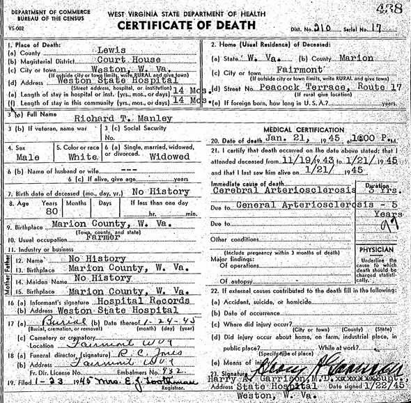 M Child 2: Harrison Jefferson Manley Census name: Harrison Manley, Jr. 10,3 Born: Oct-28-1895 in West Milford, Harrison Co, WV 6,11 Died: Jul- 2-1983 in Fairmont, Marion Co, WV 6 Buried: in Sheets Mill (Old West) Cemetery, West Milford, Harrison Co, WV 6 Resided: 1937 in Fairmont, Marion Co, WV 11 Census: 1900, 1910 in Marion Co, WV Occupation: tire recapper 6 Wife: Pearl M. West b. Nov-22-1905 d. May-12-1996 Married: Apr- 3-1937 in Fairmont, Marion Co, WV 11