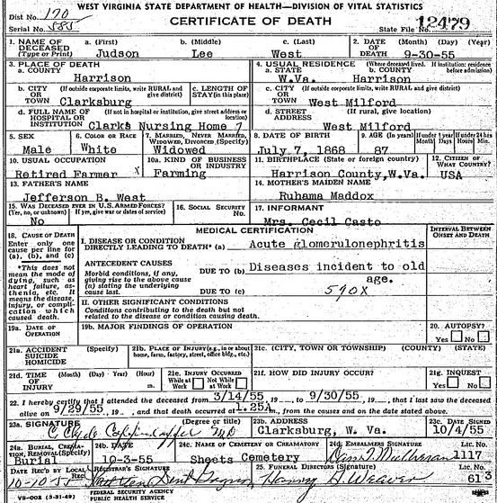 Jul-28-2018Husband: Judson Lee West Born: Jul- 7-1868 in Harrison Co, WV 1 Baptized: West Milford Bapt Ch in West Milford, Harrison Co, WV 2 Died: Sep-30-1955 in Clarksburg, Harrison Co, WV 3 Buried: in Sheets Mill (Old West) Cemetery, West Milford, Harrison Co, WV 1 Resided: in West Milford, Harrison Co, WV 3 Census: 1910, 1920 in Grant District, Harrison Co, WV 4 Occupation: farmer 3 Father: Jefferson Bowell West (1826 - 1902) Mother: Ruhama Maddox (1833 - 1909)