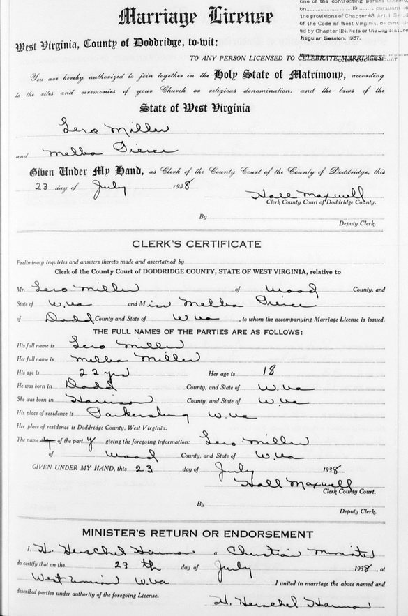 Wife: Melba Pierce 2 Married: Jul-23-1938 in West Union, Doddridge Co, WV 4