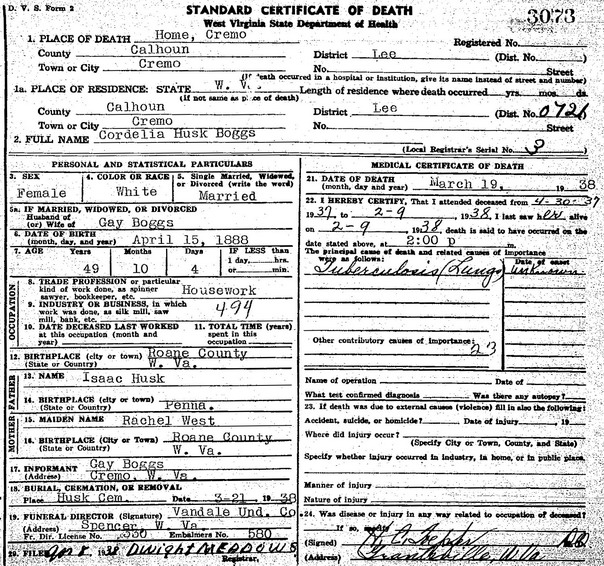Wife: Cordelia Husk Married: Apr-14-1912 in Calhoun Co, WV 2 Born: Apr-15-1888 in Roane Co, WV 5,6,2 Died: Mar-19-1938 in Cremo, Calhoun Co, WV 6 Buried: in Isaac Husk Family Cem, Calhoun Co, WV 7 Resided: in Cremo, Calhoun Co, WV 8,6 Resided: 1912 in Calhoun Co, WV 2 Father: Isaac Husk (1846 - 1928) Mother: Rachel West (1850 - 1929) Notes