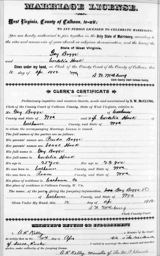 Jul-28-2018Husband: Gay Boggs Born: Jul-14-1887 in Calhoun Co, WV 1,2 Died: Apr- -1968 1 Buried: in St. Paul Cemetery, Mt. Zion, Calhoun Co, WV Resided: in Grantsville, Calhoun Co, WV 3 Resided: 1938 in Cremo, Calhoun Co, WV 4 Father: Pruda Boggs