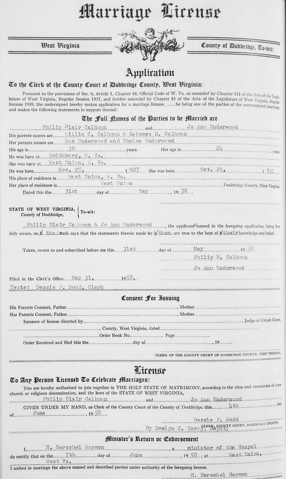 Wife: Jo Ann Underwood Also known as: JoAnn Underwood Married: Jun- 7-1958 in West Union, Doddridge Co, WV 2,6 Born: Oct-29-1933 in West Union, Doddridge Co, WV 3,2 Died: Oct-24-1991 in Morgantown, Monongalia Co, WV 3 Resided: in West Union, Doddridge Co, WV 3,10,2 Father: Rex O. Underwood (1900 - 1975) Mother: Thelma Marie Freeman (1908 - 1995) Notes 3