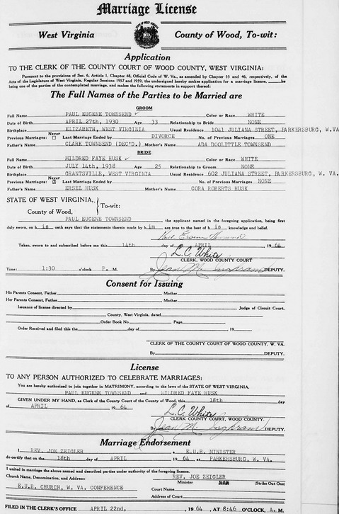 Sources: (1) Wood County Marriage Records, Parkersburg, WV. (2) Social Security Death Index. (3) Social Security Death Index, Social Security card issued in West Virginia before 1951. (4) Social Security Death Index, SSDI entry is for M. Townsend, b. Jul 14 1938, d. Apr 15 1990, Social Security card issued in West Virginia in 1954. Death date has also been reported as Apr 30 1990.Name Index