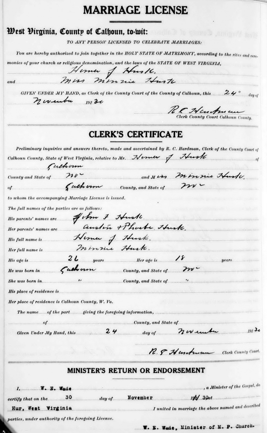 Wife: Minnie J. Husk Married: Nov-30-1930 at Hur, Calhoun Co, WV 6 Born: Mar-18-1912 in Hur, Calhoun Co, WV 7,2 Died: Jan-25-1996 in Parkersburg, Wood Co, WV 8,2 Buried: in Husk Cemetery, Hur, Mt. Zion, Calhoun Co, WV 7 Resided: in Grantsville, Calhoun Co, WV 7,2 Occupation: inspector for General Motors, Parma, OH 7 Father: Samuel Austin Husk (1874 - 1967) Mother: Phoebe Adaline Tuttle (1882 - 1979)