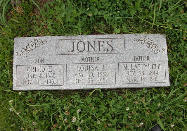 Jul-28-2018Husband: Creed Hill Jones Born: Jun- 4-1885 in West Union, Doddridge Co, WV 1,2,3,4 (see note 1) Died: Nov-11-1961 in West Union, Doddridge Co, WV 2,4,3,5 Buried: in Oxford Baptist Church Cemetery, Doddridge Co, WV 4 Resided: 1952 in Blandville, Doddridge Co, WV 6 Census: 1920, 1930 in Southwest District, Doddridge Co, WV Father: Lafayette Marion Jones (1849 - 1935) Mother: Louisa Jane Richards (1858 - 1952) Other spouse 2 Notes 2