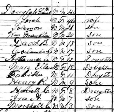 Jul-28-2018Husband: Samuel Hall Douglass Born: May-30-1834 in Barbour Co, (W)VA 1,2 Died: Aug-15-1909 in Doddridge Co, WV 3 Buried: in Cabin Run Cemetery, Doddridge Co, WV 2 Resided: at Cabin Run, Doddridge Co, WV 4 Census: 1870, 1880, 1900 in Central District, Doddridge Co, WV Occupation: farm manager, school commissioner 1 Father: William Douglass (1810 - 1901) Mother: Mary "Polly" Nutter (1810 - 1901)