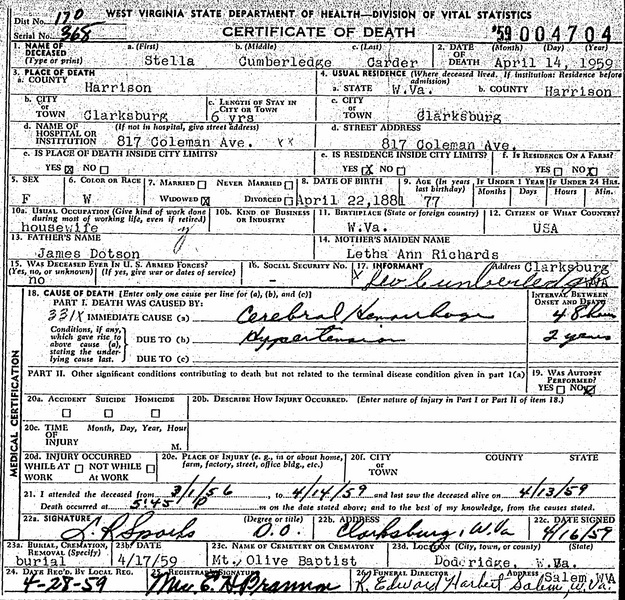 Wife: Stella Frances Dotson 4,5 Married: ca 1903 6 Born: 1883 in Ritchie Co, WV 1,4 (see note 1) Died: Apr-14-1959 in Clarksburg, Harrison Co, WV 7,1 Buried: in Mt. Olive Baptist Cemetery, Patterson Rd, Salem (Doddridge Co), WV 2 Resided: in Clarksburg, Harrison Co, WV 7 Census: 1940 in Greenbrier District, Doddridge Co, WV Census: 1930 in Coal District, Harrison Co, WV Census: 1920 in McElroy District, Tyler Co, WV Census: 1910 in Court House District, Taylor Co, WV Father: James K. Polk Dotson (1846 - 1922) Mother: Letha Ann Richards Other spouse 2 Notes