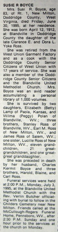 Born: Apr-15-1908 in New Milton, Doddridge Co, WV 1 Died: Feb- 4-1935 in Clarksburg, Harrison Co, WV 1 Buried: in Childers Cemetery, New Milton, Doddridge Co, WV 2,1,3 Cause of death: septicemia from neglected deep-seated abcess 1 Resided: in New Milton, Doddridge Co, WV 1 Census: 1920, 1930 in New Milton District, Doddridge Co, WV Father: Thomas Jefferson Boyce (1877 - 1969) Mother: Caroline Myrtle Starkey (1873 - 1914)Wife: Susie Mildred Ross 4,5,6 Married: ca 1930 7 Born: Apr-12-1912 at Blandville, Doddridge Co, WV 8,9 Died: Jun-30-1995 in New Milton, Doddridge Co, WV 10,9 Buried: in Childers Cemetery, New Milton, Doddridge Co, WV 8,2 Resided: in New Milton, Doddridge Co, WV 8,11 Resided: 1962, 1986, 1988 in Blandville, Doddridge Co, WV 12,13 Occupation: West Union Garment Factory, cook at Senior Citizen Center 8 Father: Clarence Edward "Buster" Ross (1888 - 1962) Mother: Dora Louise Yoke (1891 - 1972)