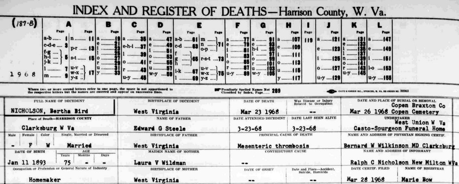 Born: Feb-25-1886 in Doddridge Co, WV 1,2,3 Died: May- 2-1973 in Clarksburg, Harrison Co, WV 4,3 Resided: in Coldwater (New Milton), Doddridge Co, WV 4 Resided: in New Milton, Doddridge Co, WV 3 Resided: 1942 in Copen, Braxton Co, WV 5 Census: 1900, 20, 30, 40 in Salt Lick District, Braxton Co, WV Occupation: miner and farmer 4,6 Occupation: 1940 coal miner 7 Father: Lewis Albert Nicholson (1860 - 1936) Mother: Mary Elizabeth Snider (1863 - 1893) Other spouse 2Wife: Bertha Bird Steele Also known as: Bertha D. Steele 8 Married: Jul-21-1909 9 Born: Jan- 1-1893 in West Virginia 10 Died: Mar-23-1968 in Clarksburg, Harrison Co, WV 10,9 Buried: in Copen Cemetery, Braxton Co, WV 10 Resided: 1942 in Copen, Braxton Co, WV Census: 1920, 1930 1940 in Salt Lick District, Braxton Co, WV Father: Edward G. Steele (1862 - ) Mother: Laura V. "Jennie" Wildman (1868 - ) Notes