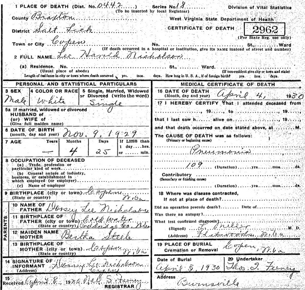 F Child 7: Mary Virginia Nicholson Born: Jun-30-1927 in Copen, Braxton Co, WV 4 (see note 1) Died: Sep-16-2006 in Bristol, Harrison Co, WV 25 Buried: in Masonic Memorial Park Cemetery, Crystal Lake (West Union), WV 4 Resided: in Bristol, Harrison Co, WV 15,17,26,4 Resided: 1948 in Coldwater (New Milton), Doddridge Co, WV 27 Census: 1930 in Salt Lick, Braxton Co, WV 6 Husband: Hayward Lewis Young b. Jul-22-1925 d. Jan-25-1987 Married: Jul-24-1948 23M Child 8: Lee Harold Nicholson 28,6 Also known as: Harold Lee Nicholson 17 Born: Nov- 9-1929 in Copen, Braxton Co, WV 28,6 Died: Apr- 4-1930 in Copen, Braxton Co, WV 28 Buried: in Copen Cemetery, Braxton Co, WV 28 Cause of death: pneumonia 28 Census: 1930 in Salt Lick, Braxton Co, WV 6