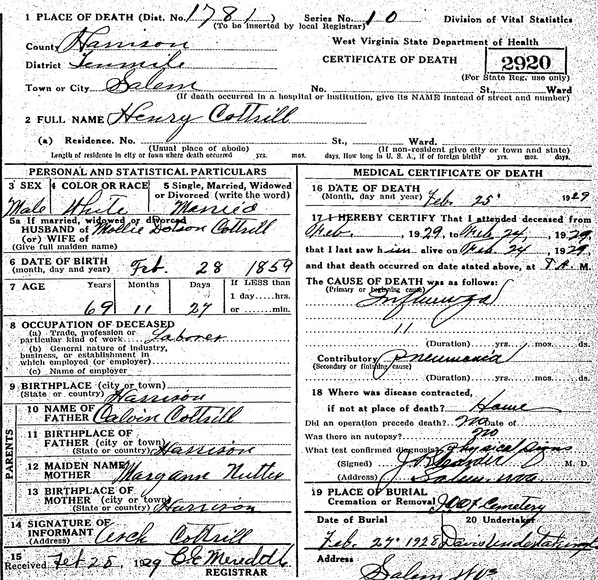 Jul-28-2018Husband: Henry J. Cottrill Born: Sep- -1862 1,2 (see note 1) Died: Feb-25-1929 in Salem, WV 1 Buried: in IOOF Cemetery, Salem, Harrison Co, WV 1 Census: 1930 in Salem, WV Census: 1920 in West Union, Doddridge Co, WV Census: 1910 in Cove District, Doddridge Co, WV Census: 1900 in Central District, Doddridge Co, WV Resided: 1886 in Doddridge Co, WV 2 Occupation: laborer 1 Occupation: 1910 farmer 3 Father: Calvin Cottrill Mother: Mary Ann Nutter