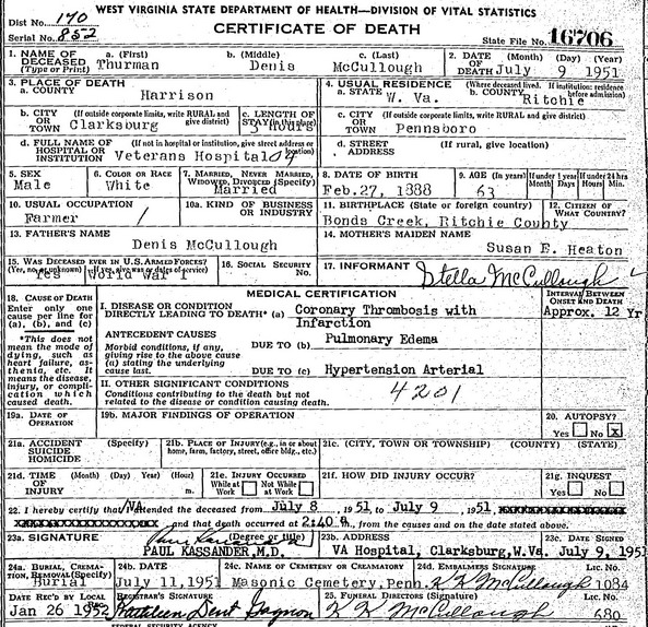 Jul-28-2018Husband: Thurman Denis McCullough Born: Feb-27-1888 in Bonds Creek (Pennsboro), Ritchie Co, WV 1 (see note 1) Died: Jul- 9-1951 in Clarksburg, Harrison Co, WV 1 Buried: in Mt. Harmony Masonic Cemetery, Pennsboro, Ritchie Co, WV 1 Resided: in Pennsboro, Ritchie Co, WV 1 Occupation: farmer 1 Military: World War I 1 Father: Dennis McCullough (1851 - ) Mother: Susan Elizabeth Heaton (1853 - 1920)