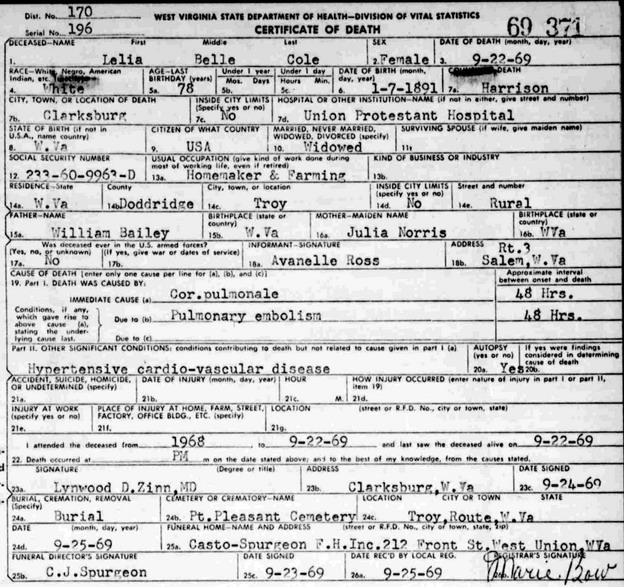 Wife: Lelia Belle Bailey 7 4,6 Married: Aug- 9-1914 in Lewis Co, WV 8 Born: Jan- 7-1891 in West Virginia 9,2,10 Died: Sep-22-1969 in Clarksburg, Harrison Co, WV 9,10,2 Buried: in Point Pleasant Baptist Church Cemetery, Fallen Timber, Doddridge Co, WV 4,9 Resided: in Troy, Gilmer Co, WV 10 Census: 1930 in Cove District, Doddridge Co, WV Father: James William Bailey Mother: Julia Ann Norris