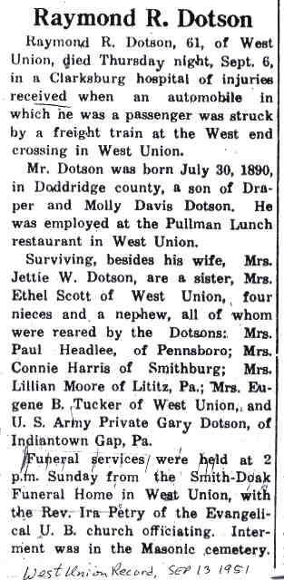 Jul-28-2018Husband: Raymond Rolf Dotson Census name: Rolph R. Dotson 1 Born: Jul-30-1890 in Doddridge Co, WV 2 Died: Sep- 6-1951 in Clarksburg, Harrison Co, WV 3 (see note 1) Buried: in Masonic Memorial Park Cemetery, Crystal Lake (West Union), WV 4,2 Cause of death: car struck by train in West Union Resided: in West Union, Doddridge Co, WV 2 Census: 1910 in West Union District, Doddridge Co, WV Occupation: Pullman Lunch restaurant, West Union 2 Father: Draper Camden Dotson (1854 - 1934) Mother: Mary Frances "Mollie" Davis (1857 - 1933) Notes 2