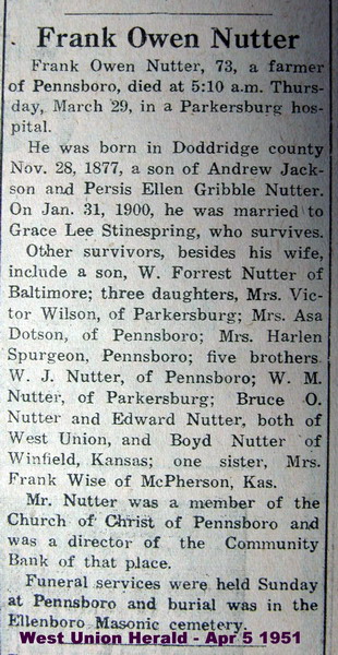 Jul-28-2018Husband: Frank Owen Nutter Census name: Owen F. Nutter 1 Born: Nov-28-1877 in Doddridge Co, WV 2 (see note 1) Died: Mar-29-1951 in Parkersburg, Wood Co, WV 2 Buried: in Ellenboro Masonic Cemetery, Ritchie Co, WV 2 Resided: in Pennsboro, Ritchie Co, WV 2 Resided: near Oxford, Doddridge Co, WV 3 Census: 1880, 1900, 10, 20 in Southwest District, Doddridge Co, WV Occupation: farmer and director of Community Bank of Pennsboro 2 Father: Andrew J. Nutter (1841 - 1920) Mother: Persis Ellen Gribble (1841 - 1899) Notes 3