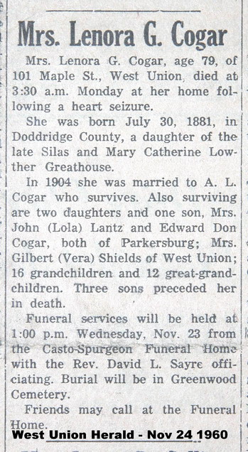 Sources: (1) Polly Walker Kreaps, Walker WV 26180,, Walker Family GEDCOM (http://txnetwork.net/walker/gedcoms/pkreaps/html/pkreaps.html) (2) Obituary of wife. (3) Death record of son. (4) 1920 Census, Doddridge County, WV (Cove District). (5) 1910 Census, Calhoun County, WV. (6) Calhoun County WV Marriages 1856-1927, Wes Cochran, 2515 10th Ave, Parkersburg, WV 26101 (Oct 1989), Identified as Abraham Coger [sic], age 23, resident of Calhoun Co; and Nora Greathouse, age 23, of Calhoun Co, dau of Silas & Mary. Married Sep 15 1904. (7) Obituary. (8) Doddridge County WV Deaths 1853-1969, Wes Cochran, 156 Gihon Meadows, Apt 150, Parkersburg, WV 26101, Identified as Lenora G. Cogar, dau of Silas Greathouse and Mary Catherine Lowther. (9) Obituary of stepmother. (10) West Virginia Births Index, 1853-1969 [database on-line], Ancestry.com. (11) Obituary of sister. (12) Ritchie County Marriage Records, Harrisville, WV, http://www.wvculture.org/vrr/va_view.aspx?Id=11544557&Type=Marriage. (13) WV State Dept of Health, Div of Vital Statistics, Death Certificate (http://www.wvculture.org/vrr/va_dcsearch.aspx) (14) Doddridge County WV Marriages 1845-1937, Wes Cochran, 156 Gihon Meadows, Apt 150, Parkersburg, WV 26101 (Jan 1993) (15) Doddridge County WV Deaths 1853-1969, Wes Cochran, 156 Gihon Meadows, Apt 150, Parkersburg, WV 26101. (16) Findagrave.com. (17) West Union Herald-Record. (18) 1940 Census, Doddridge County, WV (Central District) (19) Cemetery marker. (20) Social Security Death Index. (21) Pleasants County Marriage Records, St. Marys, WV. Event Notes Note (1) Birthplace given in marriage record as Doddridge County. Name Index