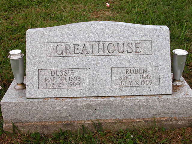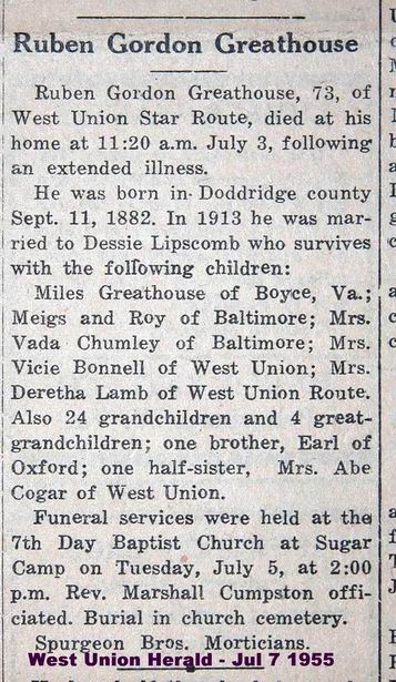 Jul-28-2018Husband: Ruben Gordon Greathouse 1,2 Born: Sep-11-1882 in Doddridge Co, WV 2,1,3 Died: Jul- 3-1955 in West Union, Doddridge Co, WV 2,4,5,3 Buried: in Middle Island 7th Day Bapt Cem, Sugar Camp, New Milton, Doddridge Co WV 3,1 Resided: 1944 in Blandville, Doddridge Co, WV 6 Census: 1920, 1930 in New Milton District, Doddridge Co, WV Mother: Sarah Melissa Greathouse (1862 - 1944)