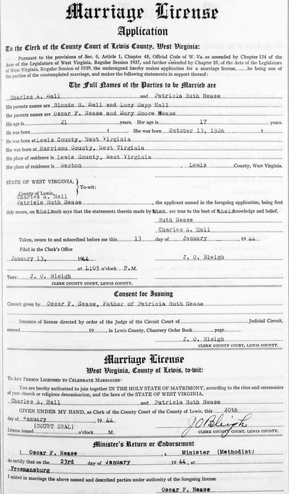 Wife: Patricia Ruth Nease Also known as: Ruth Nease 2 Married: Jan-23-1944 in Freemansburg, Lewis Co, WV 3,2