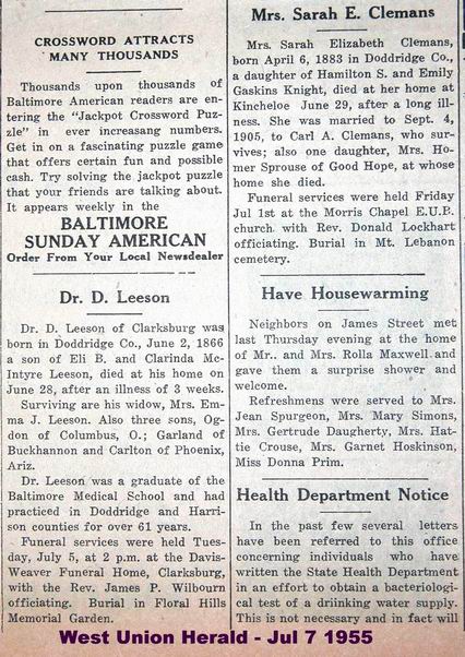 Jul-28-2018Husband: Theodore "Dora" Leeson Also known as: Dr. D. Leeson 1,2 Born: Jun- 2-1867 in Doddridge Co, WV 3 Died: Jun-28-1955 in Clarksburg, Harrison Co, WV 1 Buried: in Floral Hills Memorial Gardens, Quiet Dell, Harrison Co, WV 1 Resided: in Clarksburg, Harrison Co, WV 1 Census: 1920 in Adamston (Clarksburg), Harrison Co, WV Census: 1900 in Cove District, Doddridge Co, WV Occupation: physician 1,4 Father: Eli B. Leeson (1833 - 1918) Mother: Clarinda L. McIntyre (1839 - 1898) Notes 1